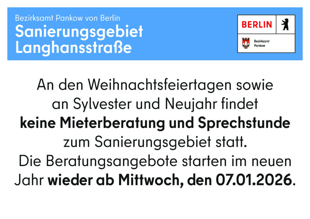 Kommen Sie mit Vertreter:innen des Fachbereichs Stadterneuerung vom Bezirksamt Pankow, des Gebietsbeauftragten sowie der Stadtteilvertretung Langhansstraße ins Gespräch und informieren Sie sich über Aktuelles aus dem Gebiet. Wir freuen uns auf zahlreiche Besucher:innen!