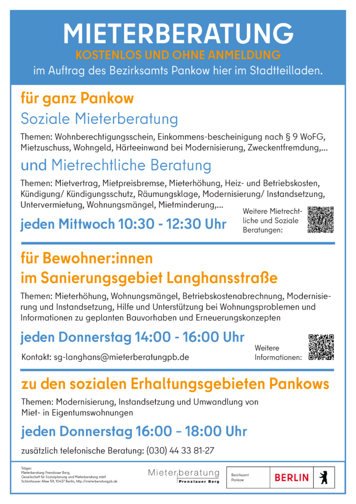 Das Angebot der kostenlosen Mieterberatung im Auftrag des Bezirksamts Pankow im Stadtteilladen wurde erweitert. Neben der Mieterberatung am Donnerstag zu den sozialen Erhaltungsgebieten in Pankow, umfasst das Angebot jetzt auch eine soziale und mietrechtliche Mieterberatung für Pankower Wohnungsmieter:innen am Mittwoch.
